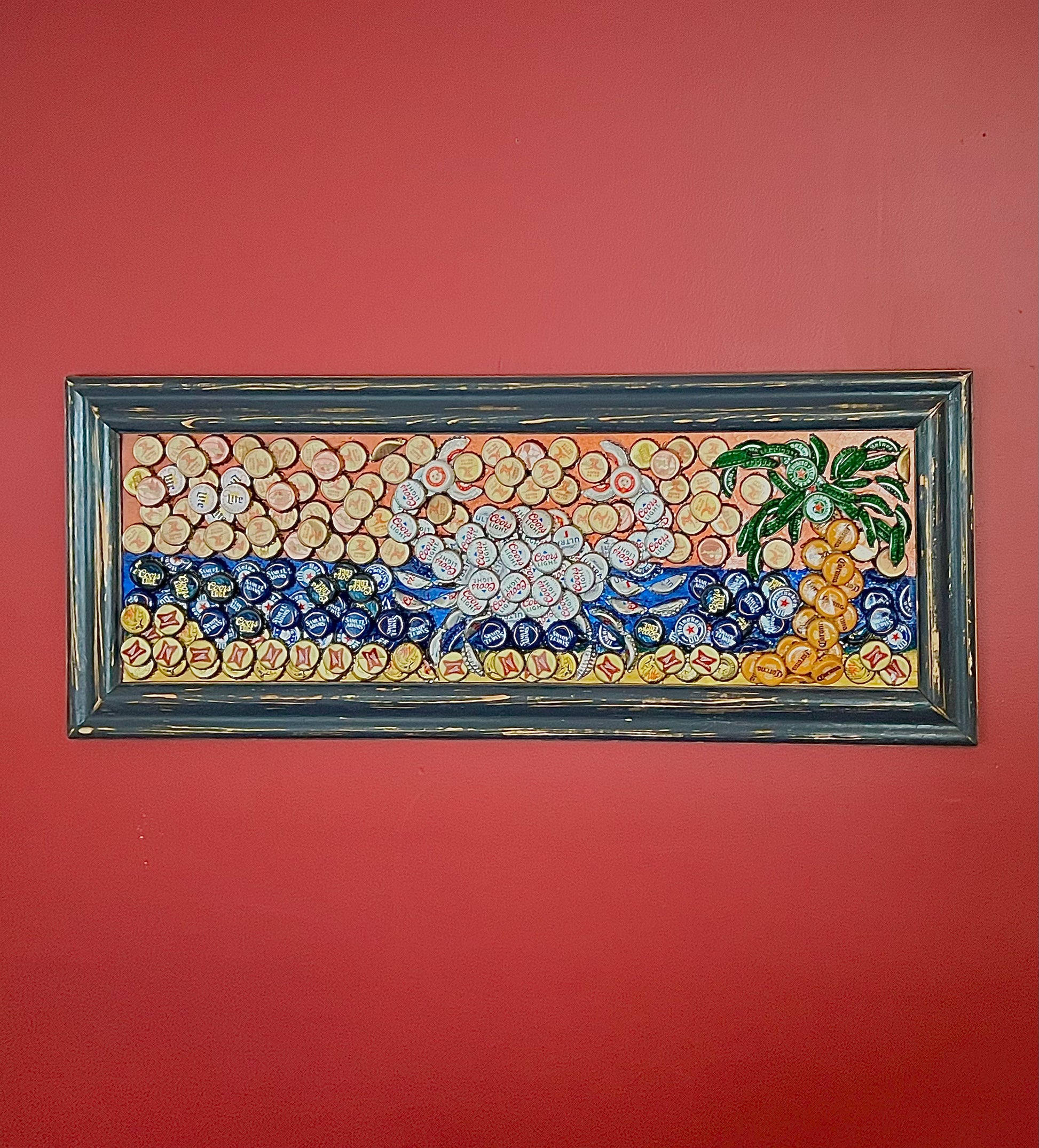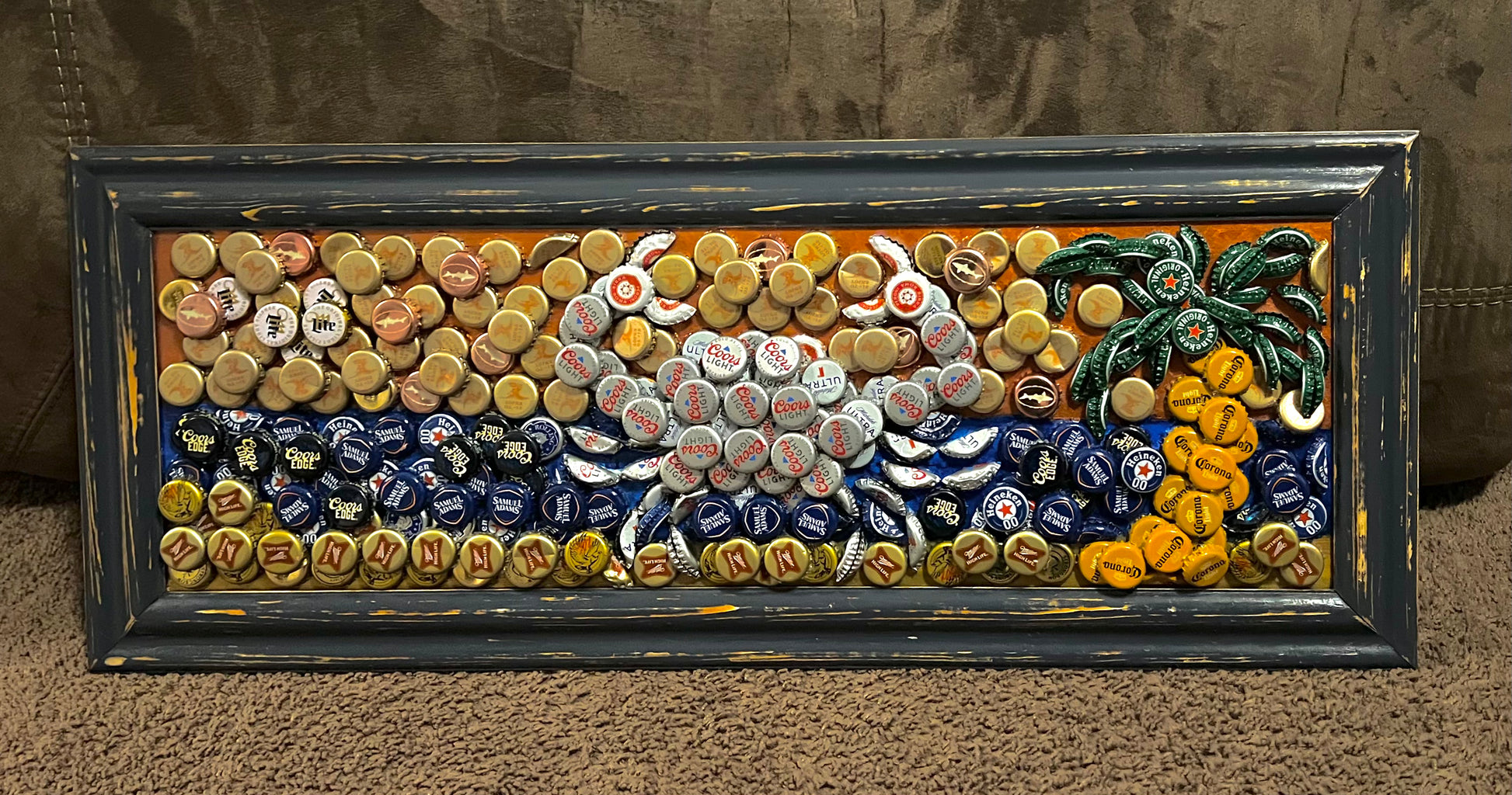 Using bottle caps, I created this awesome crab and palm tree design with a 3D effect on an old picture frame that was sanded, painted, and stained. It turned out amazing!
