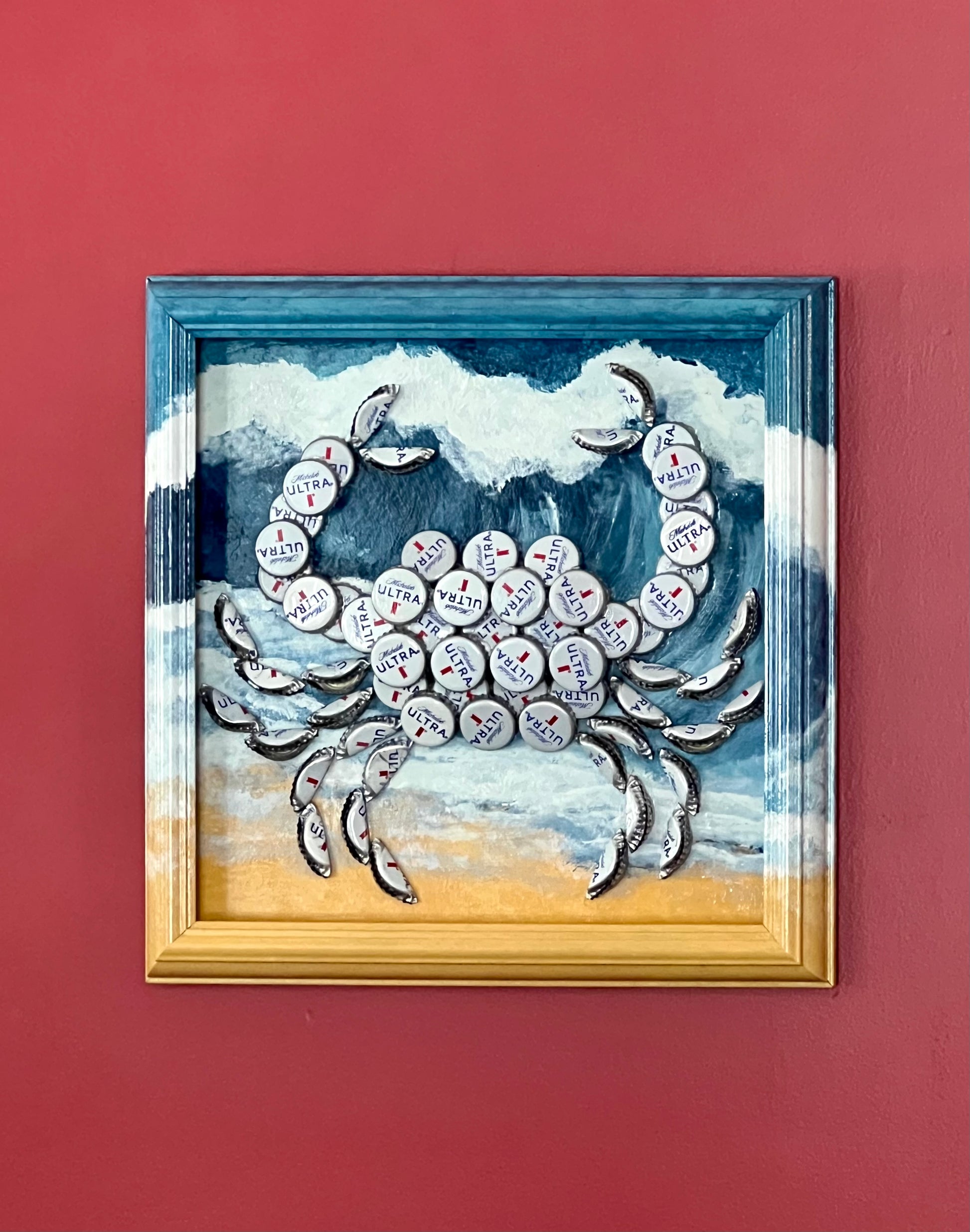 Upcycled old vintage framed print. Removed glass and hand painted a wave over the print background and the frame itself. Hot glued bottle caps to create a 3D crab in the center. Absolutely beautiful and the perfect beach theme decor!